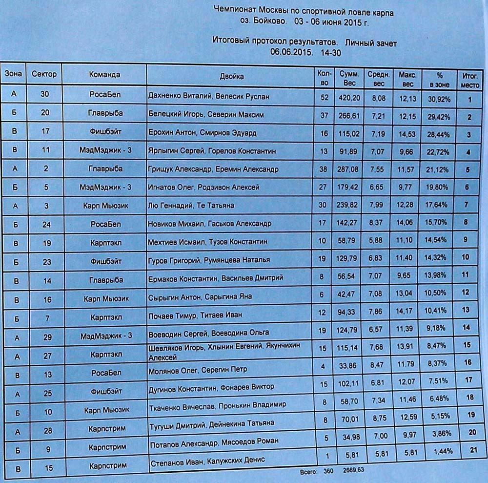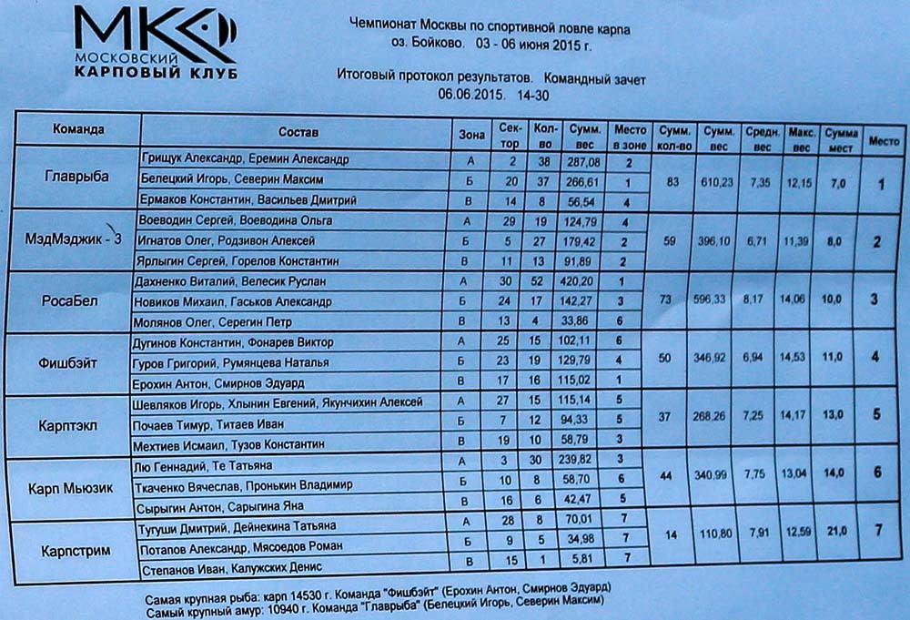 Наша команда Carptoday (двойка Ерохин Антон + Смирнов Эдуард в составе команды Фишбэйт) заняла первое место в своей зоне «В», а в в личном зачете в ожесточенной, но дружественной борьбе, смогла добиться 3-го места с результатом в 115 кг, и взяла отдельный приз за самую крупную выловленную рыбу Биг Фиш — 14,5 кг.