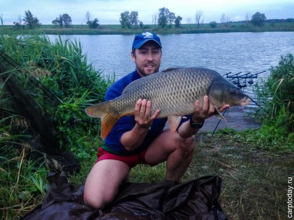 Про соседей я уже и не помню. Самое важное для меня было на тот момент поймать за 5 часов рыбу. Я понимал, что любая моя поклевка может стать потенциальным биг фишем турнира. На тот момент я ловил успешно на новину от CCMoore – Equinox. Я сделал ставку на неё, тем более, что в предыдущий день я хорошо отловился на эти бойлы. В общем, я забросил два удилища по краям от пятна и уселся ждать. Соседи активно таскали «тузиков» от 300 гр до 1 кг. Изредка кто-то ловил рыбу на 1,5 кг и это уже считалось биг фишем. Я ждал. На меня смотрели улыбаясь. У многих на лице читалось: «Что он вообще тут делает?» И вот глядя на очередную такую ухмылку соседей у меня случается паровоз! Вываживание — карп на 4 кг на мате. Подсачивать приходилось одному, но я справился, несмотря на крутой и скользкий берег. Ухмылки с лиц соперников сразу сошли, а в мою сторону устремились судьи и оператор. Для меня это уже была победа. Победа в первую очередь над собой. Но через час случился еще один паровоз и карп на 5 500 тоже припарковался на мат. В общем, оператор уже до конца соревнований не покидал мой мини-сектор.